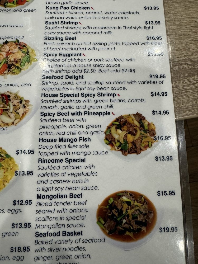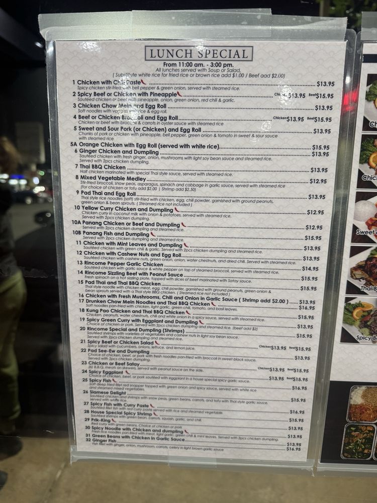 For curry aficionados, Rincome’s offerings like the Pineapple Shrimp Curry and Gas Mus Mun provide a delightful experience, blending spices with fresh ingredients. Their noodle soups, such as the Tom Yum Seafood, offer a comforting warmth that's perfect for any occasion.