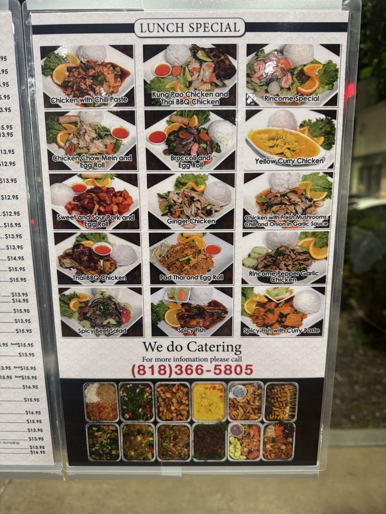 Welcome to Rincome, a beloved gem in Northridge, CA, where Thai cuisine meets a seafood lover's paradise. This casual eatery boasts an extensive menu highlighted by rich seafood dishes and flavorful salads. Specialties like the Siam Delight, featuring sautéed chicken and shrimp, and the Seafood Mint Leaves, stir-fried with garlic and spicy green chili, are sure to ignite your taste buds.